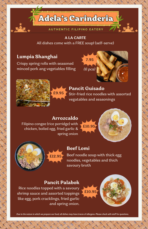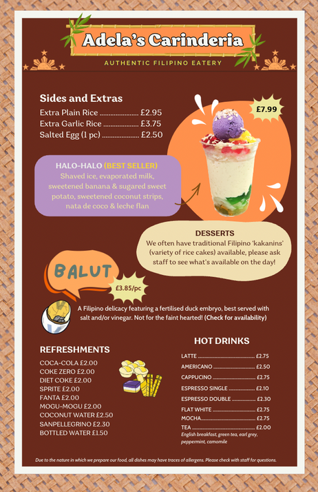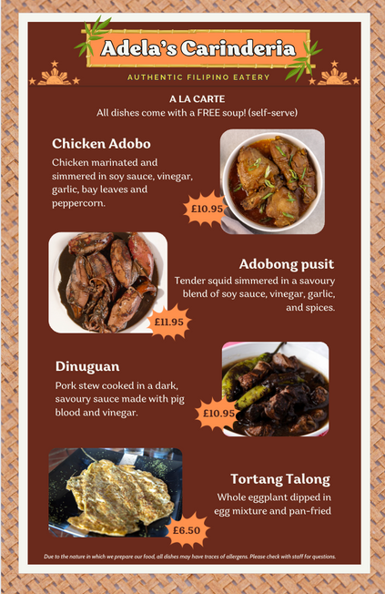 My name is Adela, and my (late) husband Robert and I have been serving Filipino food in Shepherd’s Bush since 2018. We are from the culinary capital of the Philippines - Pampanga. Robert was a professional chef who shared his knowledge with me. We had always dreamed of opening our own eatery here in London and have proudly been serving Filipino dishes you would typically find in carinderias in the Philippines.