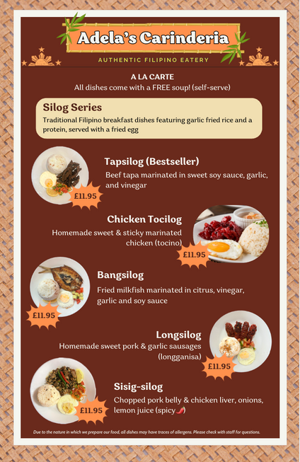 Serving breakfast dishes every day, including Longsilog, Tapsilog, Sisig-silog, Chicken Tocilog, Bangsilog, Pansit Guisado, Chicken Arozcaldo, Pansit Palabok, Fresh Lumpia & Beef Lomi.